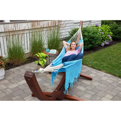The Bahia Brazilian outdoor hammock adds comfort to the quality time that you spend outdoors. This versatile double hammock for the outside can accent your patio furniture, add more comfort to your backyard, or be your go-to lounge spot on the porch. Bring it along while traveling and relax near the campfire with this comfortable tree hammock. The durable patio swing has been handcrafted with high-grade cotton fabric and will add a bit of luxury to your life. Take a moment to enjoy the simpler things in life while you sit back and relax on this 60 x 87-inch two-person hammock. This traditional South-American hammock comes with a coordinated fabric bag for your convenience. Spend time relaxing solo or swinging with others, this patio hammock swing has a weight capacity of 450 pounds. HAMMOCK STAND SOLD SEPARATELY!