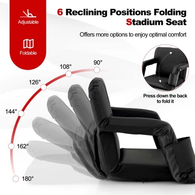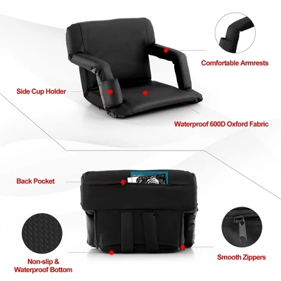 - 6 Position Adjustable Backrest: The stadium bleacher seat is equipped with a 15” x 18.5” backrest, which fits the curve of your body and provides reliable support for your back. In addition, the backrest has 6 reclining positions so you can choose the ideal sitting position under different conditions.