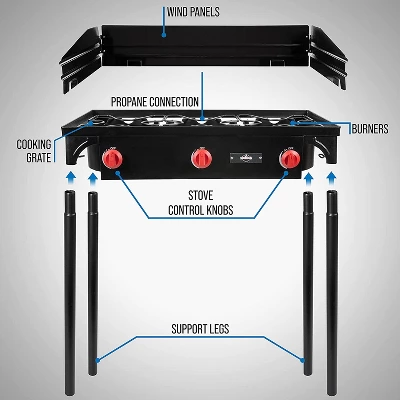 - Experience fast, powerful outdoor cooking with a high heat output propane stove, up to 225,000 BTU
