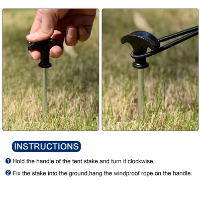 What is this?The tent stake is designed with a T-shaped plastic handle, which is convenient for grasping. The metal screw rod and pointed bottom make the stake easier to nail into the ground and grip more tightly. Widely used in various places, such as sand, lawn, soil, ice surface, hard ground and so on to fix your camping tent, picnic mat, rain tarps, canopy, fabric net, outdoor inflatable sofa, etc.What will I get?Type: T ShapeMaterial: Galvanized Iron, PlasticOverall Size: 20cmx4.7cm / 8″x1.9″(L*W)Rod Length: 16.2cm / 6.4″Screw Rod Diameter: 7.5mm / 0.3″Are there any advantages of the product?These galvanized ground pegs are waterproof, windproof, rustproof, sturdy, durable and not easy to be bend.How to use it?Hold the handle of the tent stake and turn it clockwise, nail the stake into the ground, then hang the windproof rope on the handle. If you want to take out the stake, you can rotate the handle counterclockwise and pull it out.What should I notice?Note: Please be careful with your hands when using these ground pegs.